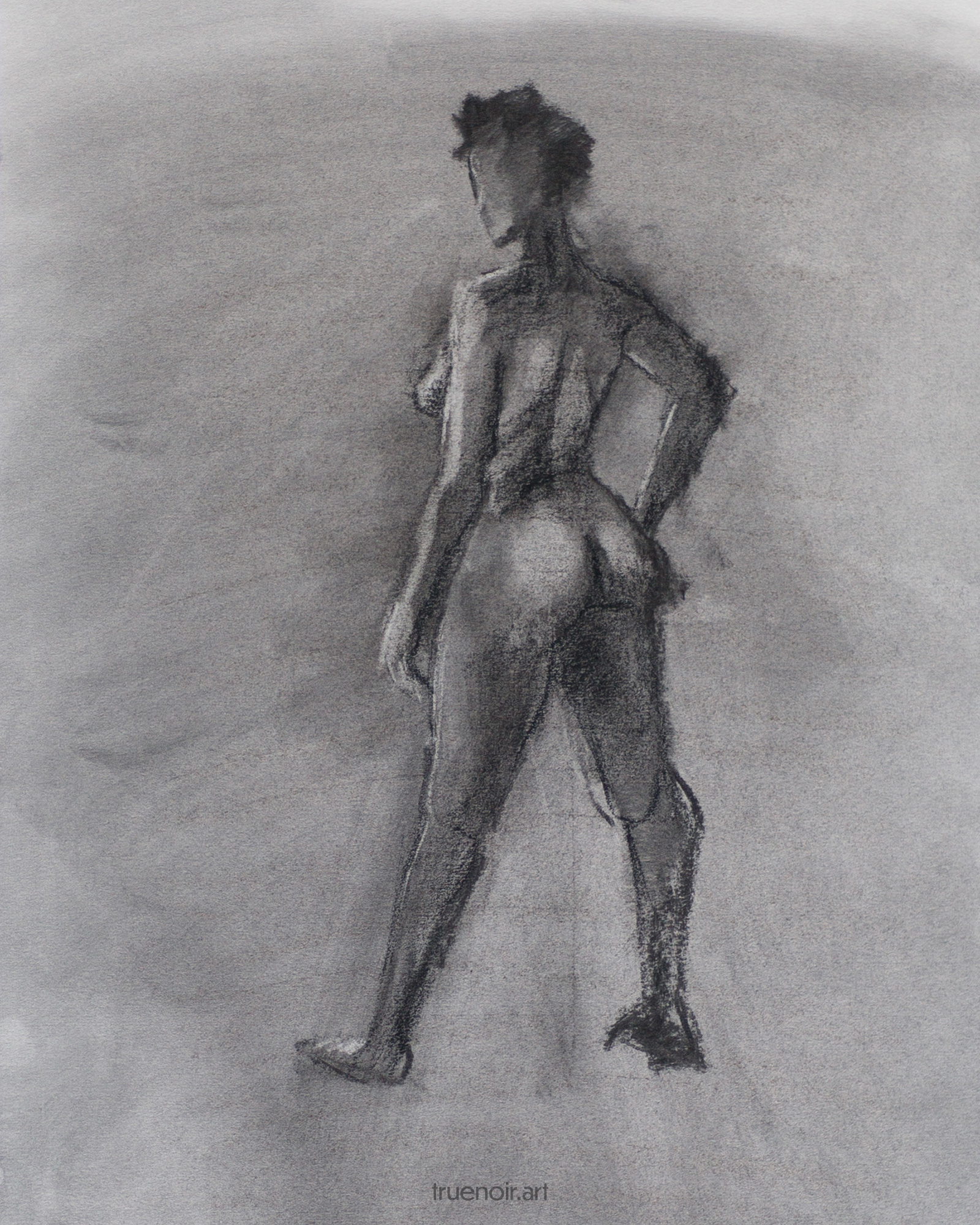 This drawing features a female half-turned figure from the back. She’s standing with one arm on her hip, and the other one relaxed along her side. Her head is turned in the same direction, towards the viewer. It is drawn from a life model with charcoal on toned gray paper.