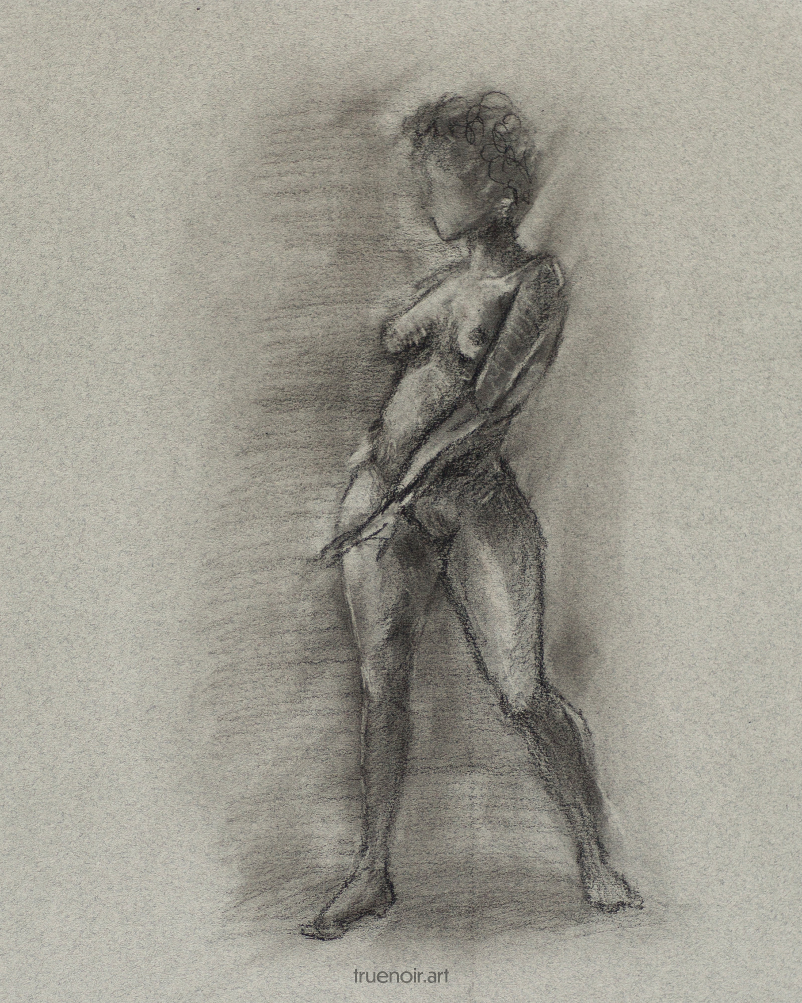 This charcoal drawing on toned neutral gray paper features a standing female figure. The model is half-turned and facing the viewer. The drawing is well detailed with finished hands and feet, but the head remains free of features, only the puffy hair is suggested. The model has one arm in front of her, frozen in a mid-swing, and the other arm is hidden behind her.