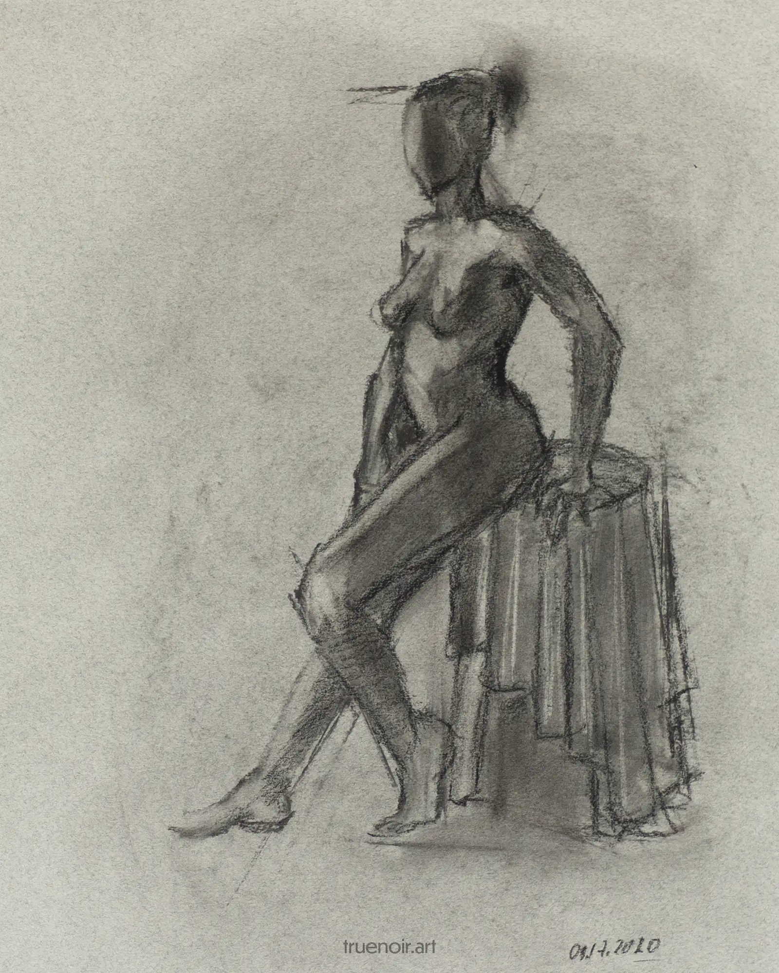 Charcoal drawing of female figure on gray toned paper. She's leaning on a tall stool covered in cloth. She's facing to the left with her right arm on right leg, the other arm slightly behind her on the stool. Her left leg is in front and slightly bend in the knee. All of the weight is on her right leg.