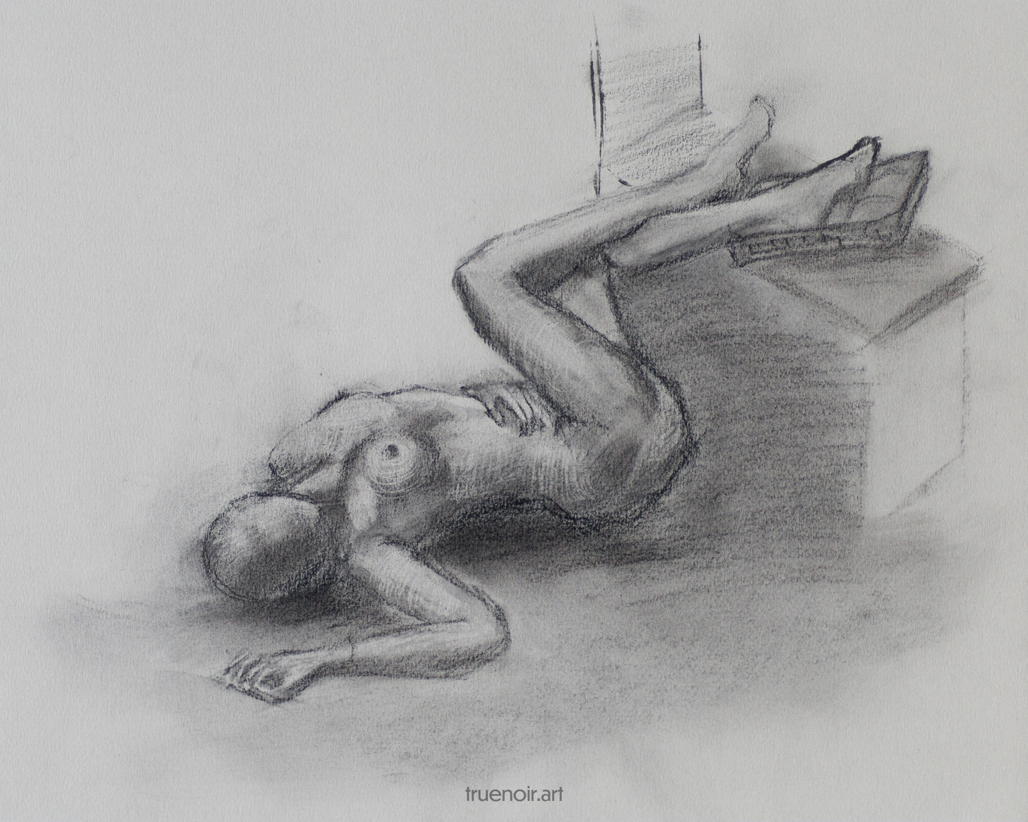 This charcoal gesture drawing captures reclined female figure. She’s lying on her back with her legs bent in the knees and up on a wooden bench. The drawing indicates overall pose and focuses more on details such as hands.
