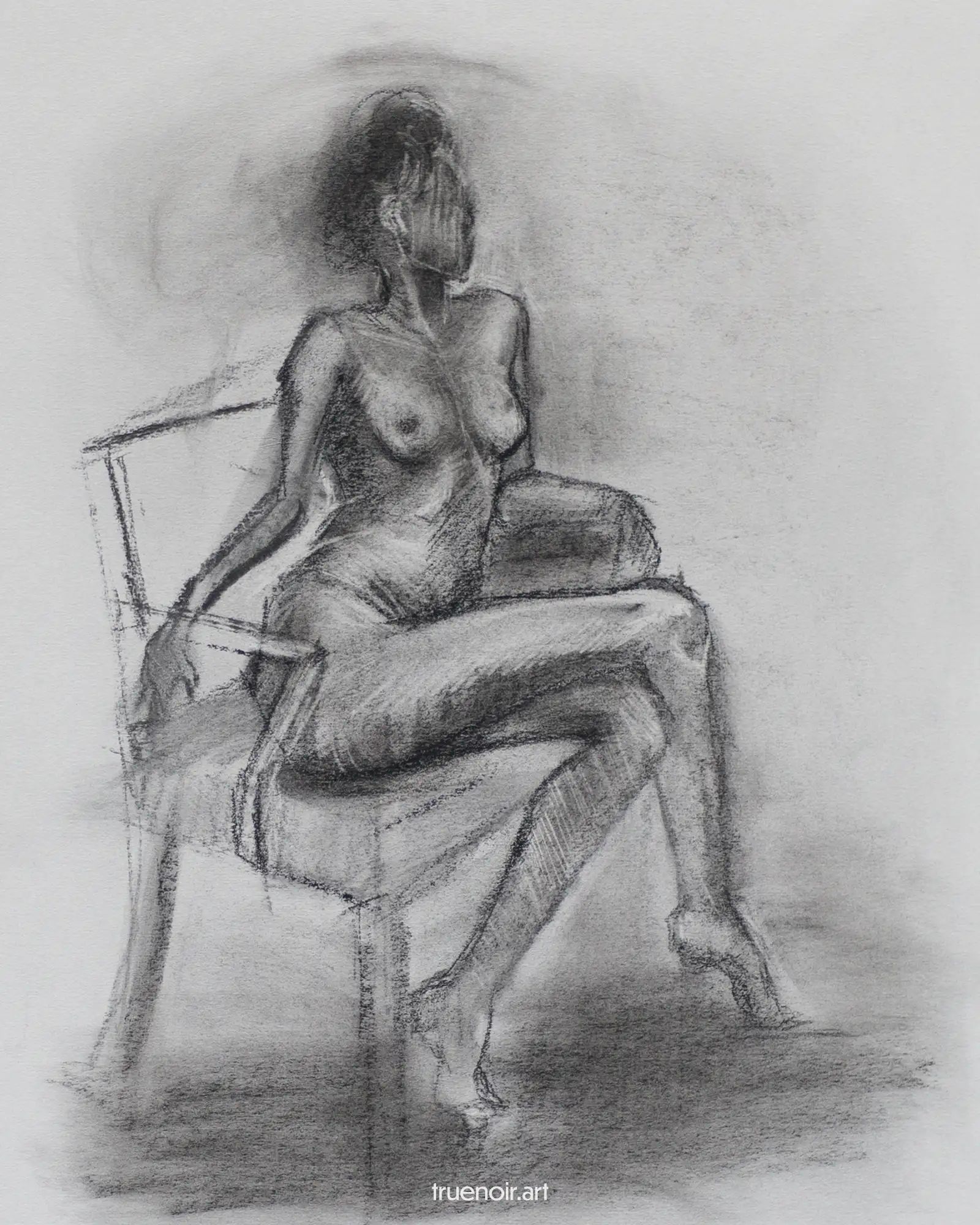 Charcoal drawing of a female figure on light gray paper. The figure is sitting in a chair with armrests and a back. She's facing to the right with her hands on armrests and legs crossed. She's leaning on her left side more and creates an interesting wave movement throughout the figure.