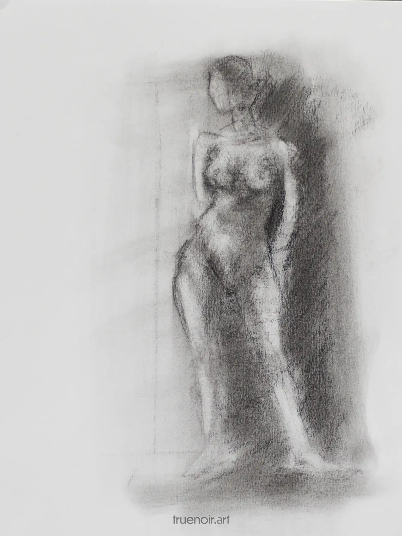 I drew this gesture from live model in 2019. I used charcoal on light-gray paper. Depicted here is a standing female figure from the front. She’s looking to the left with her arms behind. She’s leaning on her right leg, which throws her hip to the side. I like the overall gesture of this pose.