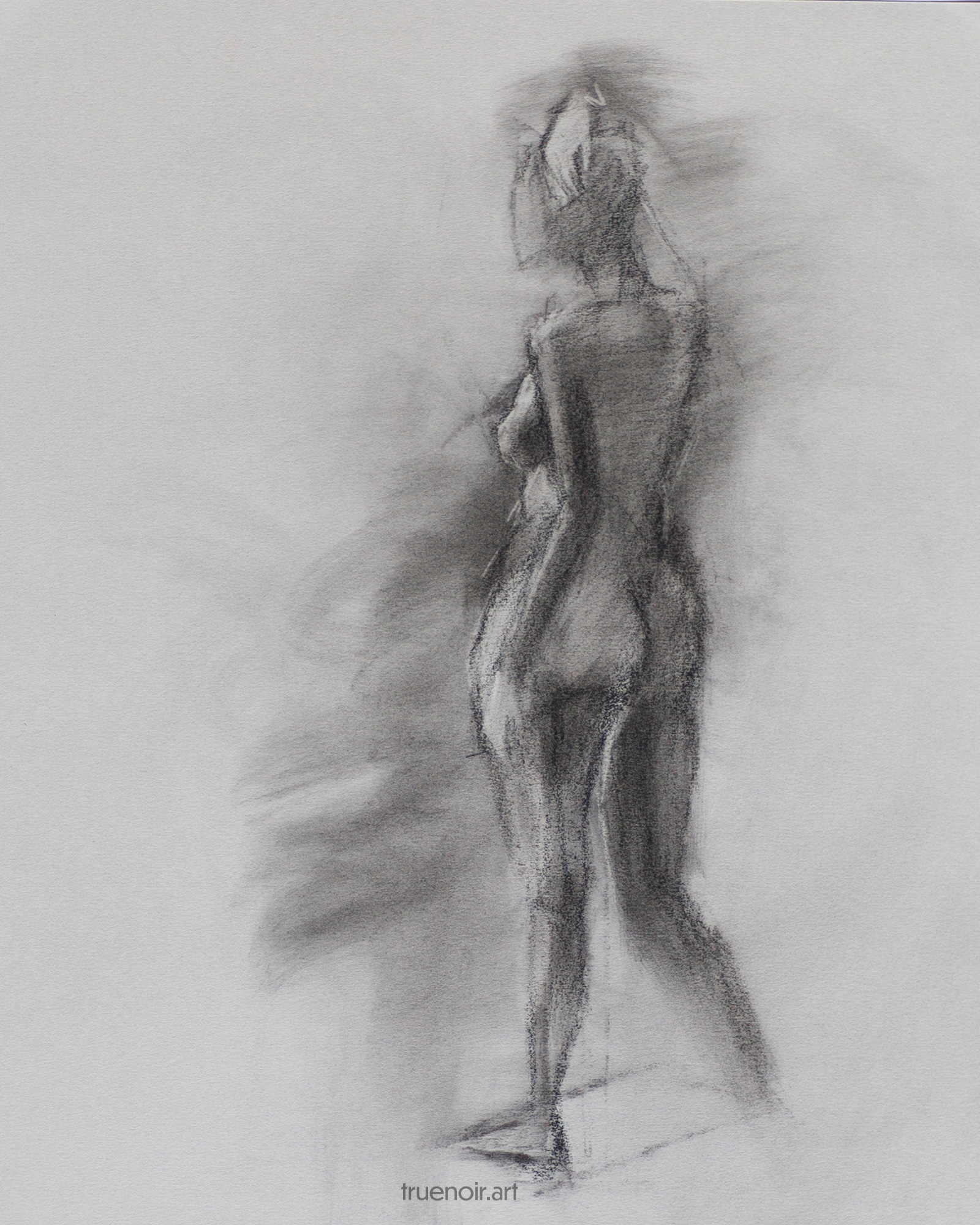 Here, the model is positioned at an angle, so that her back and side are visible. She stands with all her weight on one leg, and the other one is relaxed. Model’s hand is resting on her head, but it seems as if her back limbs disappear into nothingness.