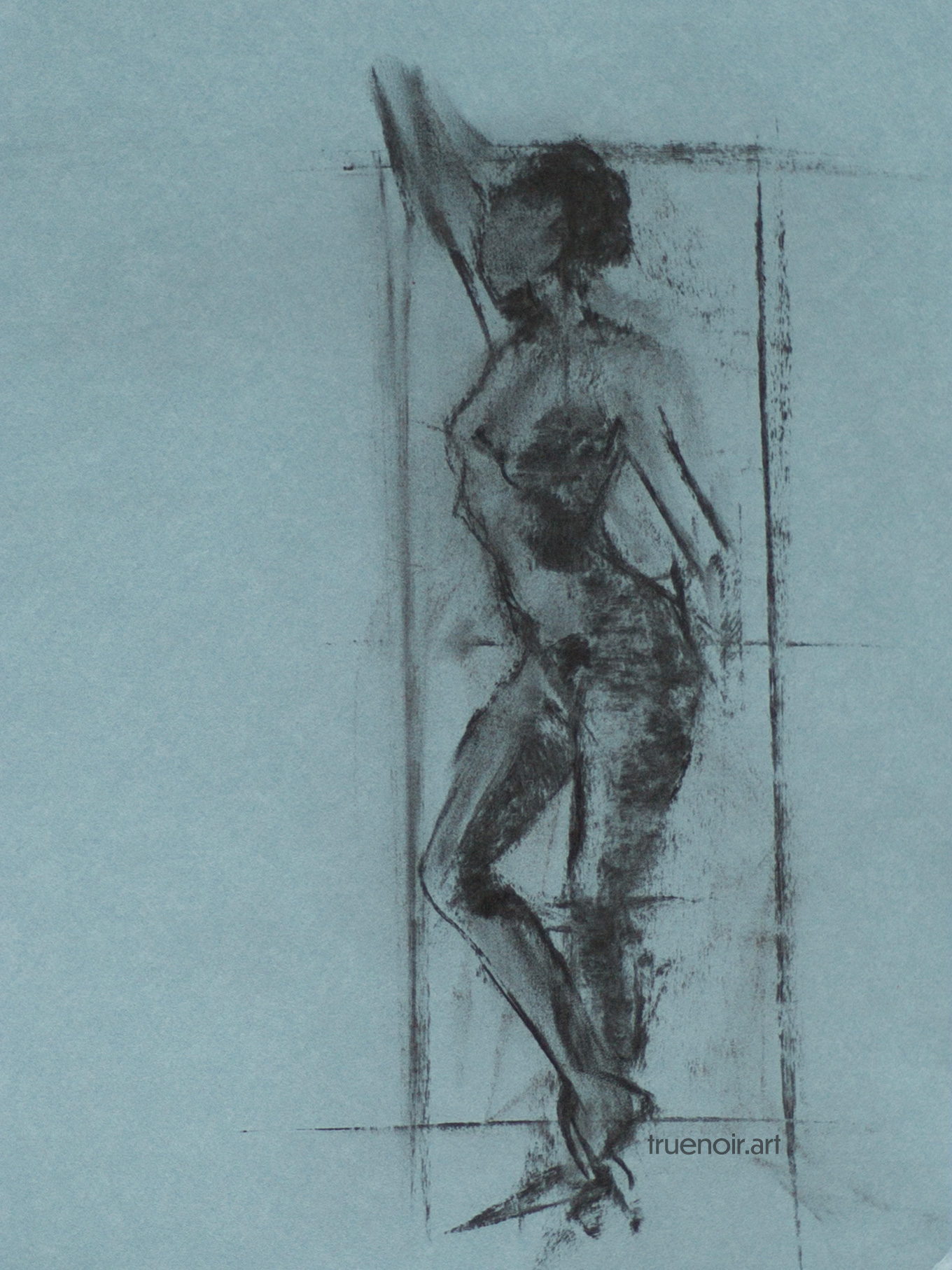My favorite medium for gesture drawings is a thick willow charcoal stick. I like that it can be used to make either thin lines with the tip, or broad strokes with the side. This quick gesture drawing depicts female figure from a side with the legs crossed. This pose is quite difficult to portray as it has an unusual dynamic element in the area where legs cross.